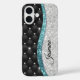 Joli chic et élégant faux argent turquoise turquoise parties scintillant d'aqua et strass bling coque iphone. Belle couverture moderne et cool pour le brancheur tendance et amateur d'art. Ce coque iphone est doté d'un motif tufté noir aux accents de parties scintillant faux argent et bleu turquoise, créant une esthétique glamour et girly. Le look texturé et le brillant argenté ajoutent une touche moderne et tendance, à la fois chic et sophistiquée. Il fait l'idée cadeau parfait pour un doux 16 anniversaire, mariage, douche nuptiale, anniversaires, baby showers ou fêtes de bachelorette, jour des valentines, Noël ou en cadeau en général. VEUILLEZ NOTER : Il s'agit de graphiques imprimés plats - pas de parties scintillant réelle, de bijoux ou de pièces surélevées