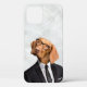Image mignonne d'un chien en costume et lunettes sur la texture en pierre de marbre blanc