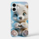 Un mignon ourson polaire avec de grands yeux expressifs et des pattes en position cardiaque se trouve dans un paysage enneigé entouré de cristaux de glace étincelants