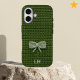 A cute little green bow is crocheted onto a darker green crochet background... on any phone case you like! This texture isn't real, of course, this is a faux crochet texture printed on the case. This design is totally fun and unique, and anyone who loves a cozy grandma or a sweet girly nostalgic style will love it! Edit the text to customize this phone case with your initials, name or simple monogram. Or remove the text for a more minimalist look. Personalize and buy this pretty phone case as a gift for a loved one who loves a girly coquette aesthetic, and a cozy grannycore style :) There are 7 different colors of this faux crochet designs in this collection.