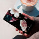 Ce coque iphone présente une belle et élégante photo de fleurs blanches, roses et bordeaux sur un arrière - plan noir. Personnalisez-le avec votre nom, mis dans une police moderne, simple, blanche. Une étagère téléphonique élégante et chic.