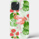 Aquarelle design motif avec des fleurs et des oiseaux flamands, la monstère et les feuilles de palmiers.