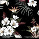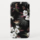 Un design de boîtier de téléphone dynamique avec un riche arrière - plan noir orné de fleurs tropicales luxuriantes et de feuilles. La composition présente des fleurs blanches aux détails complexes, complétées par des feuillages verts et bordeaux.