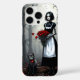 +AI ART+ Robot gothique fille avec des fleurs rouges et son chaton branché debout dans une forêt. Es-tu son véritable amour ? Elle t'attend.