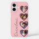 Concevez votre propre étui téléphonique avec ce joli étui modèle photo iPhone 16 avec espace pour ajouter 4 photos personnalisées. Téléchargez vos photos préférées et customisez le nom avec votre personnalisation. Un grand cadeau pour grand-mère quand vous ajoutez vos propres photos des petits-enfants. Dispose d'une couverture rose douce avec des arrière - plans de coeur de parties scintillant sur les modèles photo du coeur. Choisissez l'iPhone 16 tel que représenté, ou votre modèle de téléphone dans la liste déroulante. Nos modèles, mignons et personnalisables, vous permettent de concevoir votre propre couverture téléphonique en ajoutant votre personnalisation et vos photos avec des noms ou des monogrammes. Ajoutez une photo pour les boîtiers de téléphone mobile faits sur mesure qui vous représentent ou vos proches. Créez votre propre, ou utilisez nos conceptions comme point de départ. Choisissez parmi différentes marques de caoutchouc, plastique ou silicone pour adapter votre téléphone. Idéal pour les filles ou les garçons qui viennent d'avoir un téléphone et qui ont besoin de le protéger, ou pour les hommes ou les femmes qui veulent montrer leur style individuel.