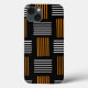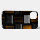 Ce boîtier téléphonique a un design moderne du milieu du siècle qui ressemble à un tissage avec des lignes orange et blanche sur un champ de noir.