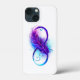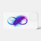 Infinity symbole with a beautiful feather painted in purple and blue bright colors on white background