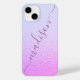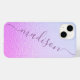 Iridescente Girly Pink Shimmer Nom personnalisé iPhone 14 Smart Phone Case dispose d'un motif moderne rose et bleu iridescente shimmer avec votre nom personnalisé en violet écriture calligraphie script typographie. Conçu par ©Evco Studio www.zazzle.com/store/evcostudio