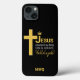 JÉSUS noir élégant M'A RANSOMÉ Christian Monogram iPhone 13 coque, proclamant le message chrétien de la victoire du Christ à la Croix. Le dessin montre une grande croix d'or jaune, et le texte qui lit JÉSUS M'A RANSOMÉ DE SIN & GRAVE HALLELUJAH! Il y a une couronne dorée au-dessus du J de Jésus. Le texte apparaît dans la typographie blanche et jaune. Tout le texte - SAUF 'JÉSUS' - est PERSONNALISABLE, donc vous avez la possibilité d'avoir seulement JÉSUS, ou vous pouvez changer 'rançonné' en 'secouru' ou 'sauvé' ; ou vous pouvez changer 'péché & tombe' en dépendance, ou 'Hallelujah' en 'Loué'. A vous de choisir ! Choisissez parmi une large sélection de cas téléphoniques chrétiens fondés sur la foi conçus par #bereandesigns.