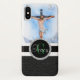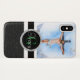 Jésus sur la Croix a une place pour votre nom et de petites taches en cuir carré sur la texture en cuir noir avec une lumière douce avec deux garnitures brillantes violet et argent et une image de Jésus accroché à la croix