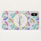 Boîtier téléphonique personnalisé avec un beau motif. Papillons aquarelles, peints dans des couleurs pastel, rose, violet, bleu, jaune et vert. Un arrière - plan d'aquarelle bleu clair avec des touches de rose clair. Placez votre nom et votre lettre monogramme à l'intérieur d'un cercle blanc avec une bordure en feuille d'or.