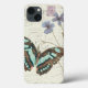 © Pela Studio / Wild Apple. Un papillon bleu et marron avec des fleurs et des tiges violettes. Un arrière - plan blanc cassé avec du texte français peut être vu sur l'image.