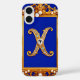 La lettre d'or X complexe, ornée de bijoux et de perles, se trouve dans un cadre décoratif de style vintage contre un arrière - plan bleu profond, mettant l'accent sur le luxe, l'élégance et le raffinement dans le design artistique.
