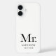 Cette étagère de téléphone élégante et minimaliste dit "Mr" dans une police de luxe moderne et de haute couture en noir et blanc, et a également une place pour votre nom de famille et date mariage.