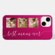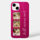 Best Mom Ever Photo Picture Élégant Script Pink iPhone 14 Smart Phone Boîtes dispose d'un design moderne et tendance simple et élégant avec le texte "meilleure maman jamais" en élégante calligraphie manuscrite typographie de script sur un arrière - plan brillant rose métallique. Ajoutez trois de vos photos préférées pour personnaliser. Conçu par ©Evco Studio www.zazzle.com/store/evcostudio