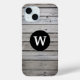 Monogramme bois rustique look coque iphone. Vous adorerez ce look rustique et tendance ! Lettre monogramme blanc dans un cercle noir et un arrière - plan de vieilles lattes de bois.