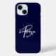 Cet élégant étui de téléphone personnalisé présente un monogramme et un prénom dans un script gris et blanc moderne sur un arrière - plan bleu marine tendance.