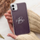 Cet élégant étui téléphonique personnalisé présente un monogramme et un prénom dans un script gris et blanc moderne sur un arrière - plan prune violet tendance.