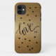 Cet Apple iPhone 11Coque, est conçu avec un Arrière - plan Faux Gold, et décoré d'une diffusion de coeurs. Le texte inclut votre Monogramme et le texte du script : Amour. Pour personnaliser avec vos initiales, remplacez simplement l'exemple de texte en utilisant notre modèle simple. Fait un grand cadeau.