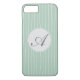 Habillez et protégez votre iphone avec un motif rayé moderne dans des couleurs turquoises et blanches cassées avec un élément de design circulaire qui est personnalisé monogrammed avec votre initiale dans une police Script élégant.