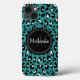 Ajoutez votre nom Stylish Blue Leopard Spots iPhone 13 Coque - Cool mignon chic turquoise bleu, noir et blanc empreinte de léopard spots motif avec plaque d'identification noire pour votre monogramme personnalisé lettre initiale et nom. Grand cadeau pour les filles qui aiment les motifs géométriques abstraits et les cadeaux monogrammés.