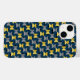 Ce boîtier téléphonique a un design moderne du milieu du siècle des ovales dans la marine avec des demi-cercles dans les tons jaune et gris dans eux sur un champ de noir.