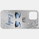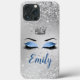 Ocean Blush Blue Parties scintillant Eyes Monogram Phone Case est doté d'une couronne d'argent Queen et d'une paire de couvercles d'oeil avec Ocean Blush Blue parties scintillant eyeshadow, doublure d'effet diamanté avec de longs cils noirs sur un arrière - plan d'effet parties scintillant argent. Personnalisez avec le nom de votre choix dans Ocean Blush Blue correspondant. Conçu par Jacqueline. Personnalisé par vous.