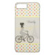 Cadeaux et accessoires chics et modernes, personnalisés avec une fille élégante montant une bicyclette avec la serviette d'Eiffel à l'arrière-plan. Décoré d'un motif de point multicolore de polka.
