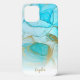Une coque iphone cool et élégante avec un motif en marbre bleu aqua et parties scintillant en faux or. Ajoutez votre nom ou monogramme à personnaliser.