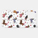 Patriotic dachshunds dressed in red white and blue with stars, stripes and dog bones on a white background.