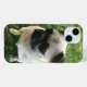 Adorable chiot carlin assis sur l'herbe, regardant sur le côté sur la photo portrait.