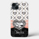 Personalize this beautiful pink and black damask FAUX PRINTED rhinestone heart and diamond look design with a pink satin bow and repeating solitaire diamond and heart patterned design. Your name can be added to the bottom of the case that is black with a subtle gray damask background. No three dimension embellishments have beadded. Image veut faire impression flat as shown in the product view. Artiwork and design © Chrissy H. Studios, LLC. La Réserve des Droits.