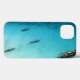 Une plage vierge sur l'île de Boracay, aux Philippines. Une file d'attente de bateaux de pêche à la traîne se trouve dans une mer azurée avec du sable blanc pur qui brille à travers. Une figure solitaire marche dans le surf.