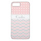 Moderne rose clair, gris, chevron blanc et pois motif iPhone 7 plus coque. Un design élégant, élégant et girly utilisant les rayures de zigzag classique et de pois mignons avec un look contemporain mais vintage dans un sens. Il y a un cadre au centre. Vous pouvez modifier la couleur arrière - plan -rose et la couleur du texte en choisissant parmi plus de 200 couleurs dans le tableau de couleurs Zazzle.
