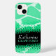 Coque iphone à motif animal brillant en vert menthe et noir jet. Personnalisez cet objet avec votre nom complet. Cet exemple est actuellement le suivant : Katherine Crawford. Ce motif original de Sarah Trett, est basé sur le dessin trouvé sur une girafe avec une superposition mi-tonalité moir gain motif.