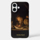 Ajoutez le nom d'un scientifique ou d'un bibliothécaire à un étui téléphonique sombre où se trouve un philosophe alchimiste sur un bureau étudiant un manuscrit ancien aux chandelles. Une main repose sur un globe terrestre à une table avec un bécher en verre et un sablier. © dotpattern