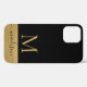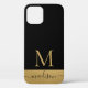 Coque iphone Monogrammé moderne Black Gold Feminine Script. Personnalisez facilement ce boîtier de téléphone moderne et élégant avec votre monogramme et votre nom personnalisés.