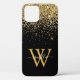 Coque moderne iPhone 12 en parties scintillant noir et or, élégamment décoré avec votre monogramme de script, prénom et initiale.
