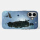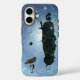 Art numérique original, Forme avec un corbeau et un point d'interrogation, sur le bleu. Coque Apple iPhone 16