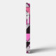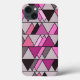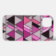 Ce boîtier de téléphone a un design moderne du milieu du siècle de triangles superposés courant horizontalement en couleurs camo rose sur un champ de gris clair.