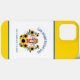 Le boîtier de téléphone coloré présente une fille ukrainienne style art populaire centre en costume traditionnel avec de grandes fleurs de soleil et le salut national "Gloire à l'Ukraine! Gloire aux héros !" en anglais et en ukrainien. Bordures bleues et jaunes du drapeau ukrainien