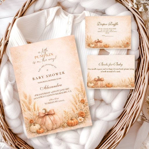 A warm and cozy fall baby shower design featuring a hand-painted watercolor pumpkin surrounded by soft peach florals, golden leaves, and delicate autumn accents. The earthy orange palette and elegant arch layout create a refined harvest aesthetic that feels timeless and inviting. Perfect for an autumn celebration, a neutral fall theme, or a charming “Little Pumpkin” baby shower with rustic floral details.