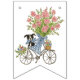 Ces drapeaux à bottes arborent un portrait aquarelle d'un mignon petit chiot assis sur un vélo avec un grand bouquet de fleurs roses et des arcs bleus et blancs.