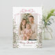 Freuen Sie sich auf die elegante Weihnachtsfotokarte. Mit vier familiären Fotos, die durch Aquarell-Evergreens, Ziergegenstände und einen festlichen Coquette-Rosa-Bogen gerahmt sind, verbindet dieses Design wunderbar saisonalen Charme mit einer modernen Touch. Die Vorderseite zeigt Ihren Urlaubsgruß und Familiennamen, während die Rückseite Platz für eine personalisierte Nachricht bietet, was jede Karte herzlich und einzigartig macht. Ideal, um während der Ferienzeit Freundinnen und Lieben herzliche Wünsche zu schicken.