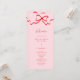 Das Hochzeitsprogramm zeigt einen fett roten Bandbogen auf einem weichen rosa Hintergrund. In Kombination mit eleganten Schriftart und funky Skripten strahlt es eine moderne, schicke und charmante Atmosphäre aus, die die Empfänger begeistern wird. Dieser einzigartige Stil Set den Ton für eine spannende Feier voraus und erfreut die Gäste beim Empfang der Karte.