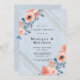 Le design présente un élément floral de couleur imprimée dans les tons coralliens et bleu poussiéreux avec des fleurs florales roses pivoines avec script de calligraphie ou écriture de type. Cadre géométrique or sur certains, mélanger et assortir pièce de collection. Idéal pour vos célébrations mariages !