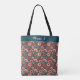 Helle korallenrote und zarte rosa Blume mit waldgrünem Blattwerk in einem Retro-Chinoiserie-Muster schaffen einen schönen Totbeutel. Helle Farben, sehr feminin, sehr stilvoll.