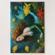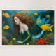 "Coralyn" - Schöne mystische Meerjungfrau. Ruhige Unterwasserwelt: Eine schöne Meerjungfrau mit schimmernden blauen Erholungen am Meeresboden in diesem stilisierten Pre-Raphaelite-Bild. Ihr langes rotes Haar fließt wie Wasser. Die Szene wird durch lebendige Fische und Korallen zum Leben erweckt, die alle in sanften, mehrfarbigen Tönen dargestellt sind, die die ruhige, bezaubernde Atmosphäre der Unterwasserwelt verstärken.