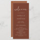 Ce programme de mariage est doté d'une police manuscrite pointue et d'un design moderne minimaliste associé à une combinaison de couleur beige et orange brûlée bohème. Modifiez facilement le libellé *most* à vos besoins et modifiez toutes les couleurs pour correspondre aux couleurs de votre événement. A utiliser pour tout événement boho, désert ou automne.