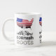 Karte der USA mit Wurzeln, und vermischte amerikanische und Cornwall Fahnen und den Text Cornish Roots darunter.
